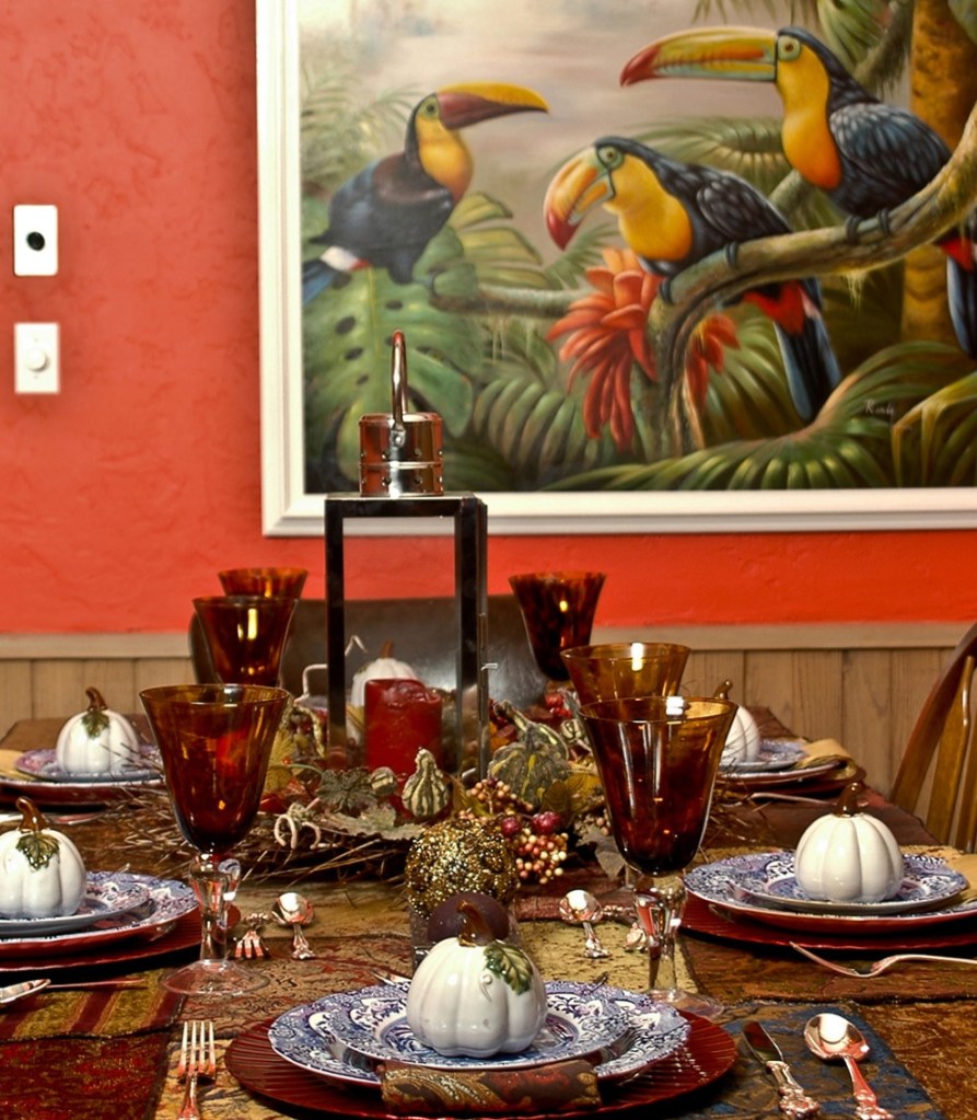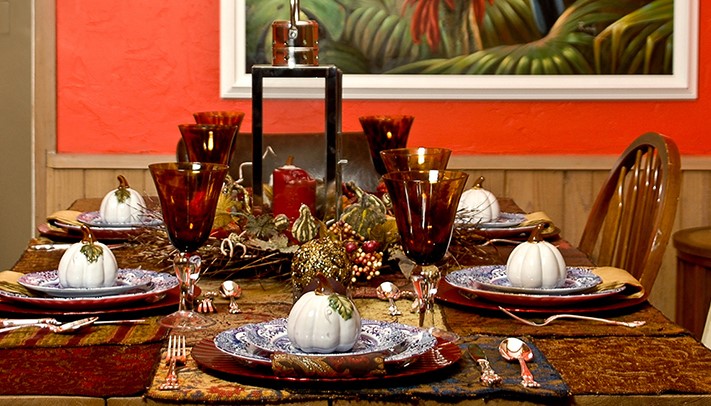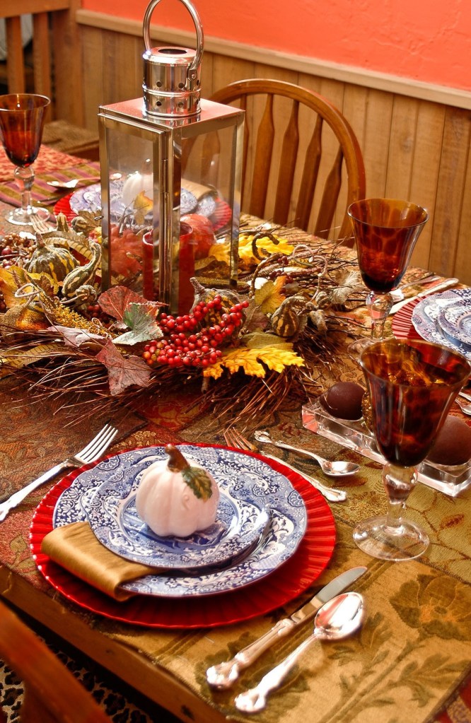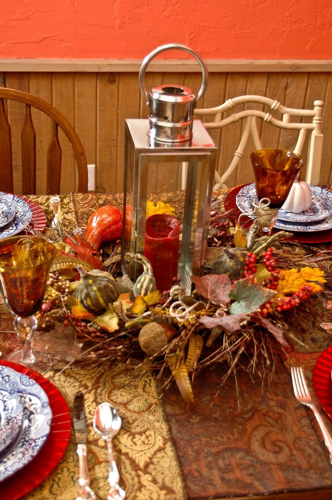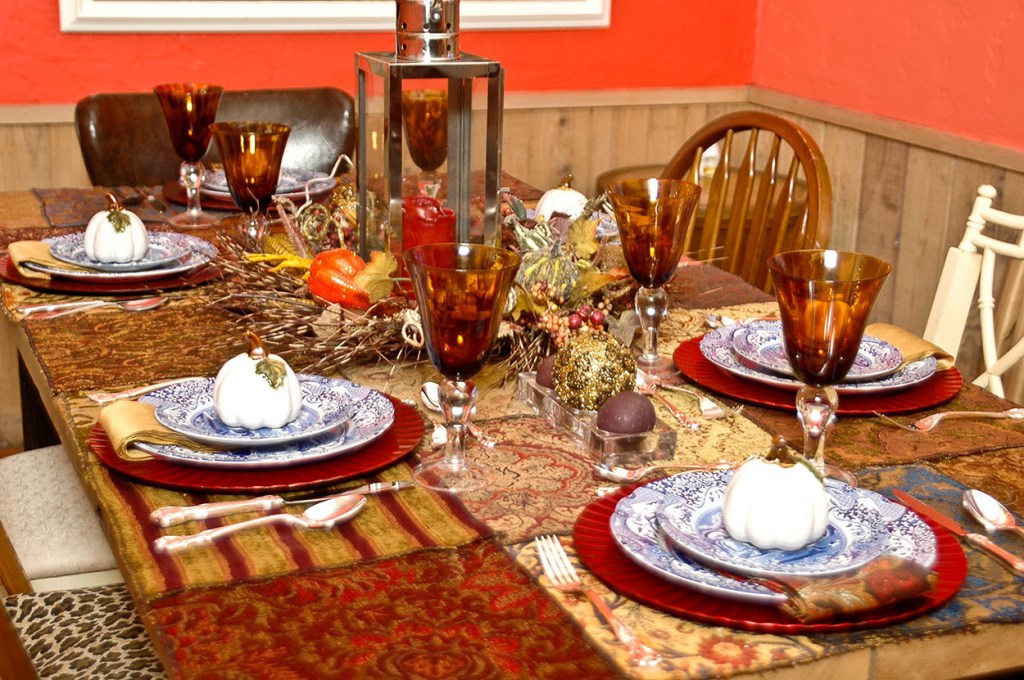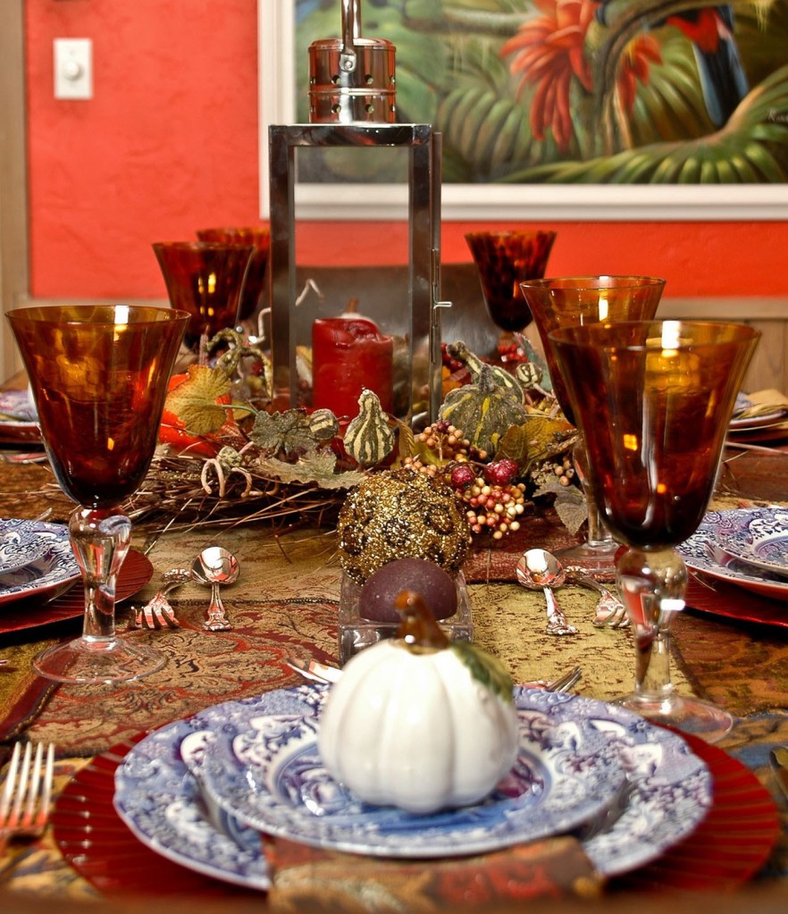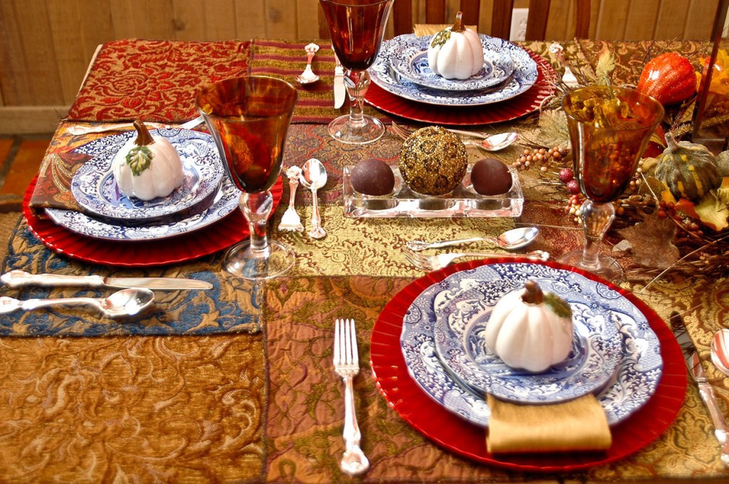 After weighing my china options, I decided that the blue and white Spode would add impact/drama. I think it elevated the look of the table. The addition of the cute little white pumpkins gives the eye a place to rest. Can you believe I purchased them at the Dollar Tree?