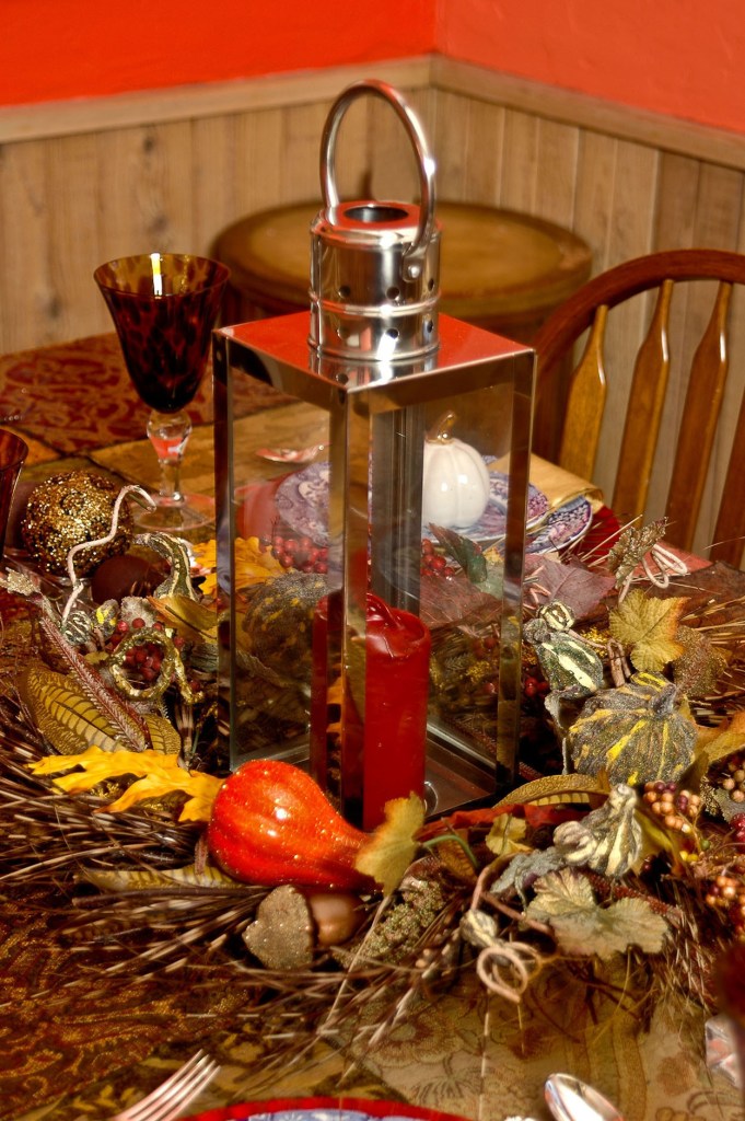 The centerpiece was super simple. I placed a preexisting wreath on the table and added a lantern and a burgundy candle.