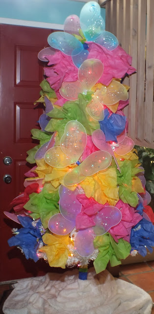 I strategically placed the fairy wings around the tree. Afterward, I filled in the existing gaps with tissue paper. I also used gift bags with yellow tissue paper to fill the space from the floor to the underside of the tree. Tissue paper also fills the spaces between the boxes and the bags. Not too shabby, huh? Be sure to read the entire post to find out the total cost of the transformation.