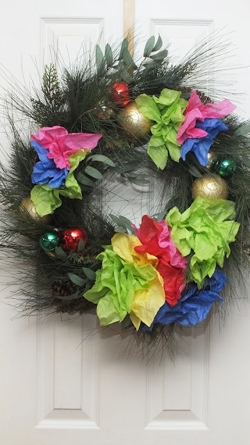 You guessed it, more tissue paper. I used the same technique on the wreath with smaller pieces of paper.