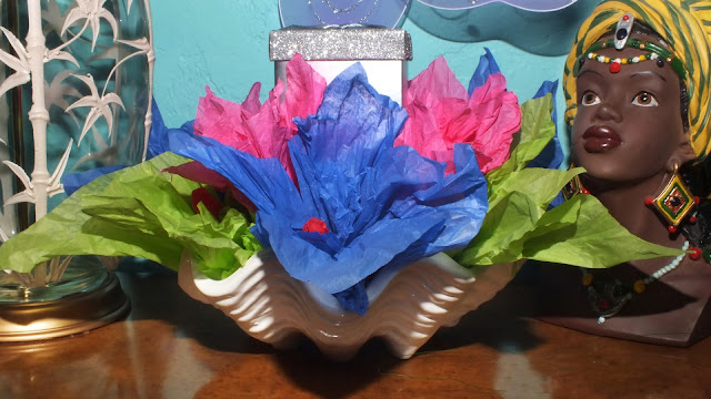 I carried the theme to the console by adding, you guessed it, more tissue paper in the seashell!. The silver box was used to give the arrangement some sparkle and pizzazz.