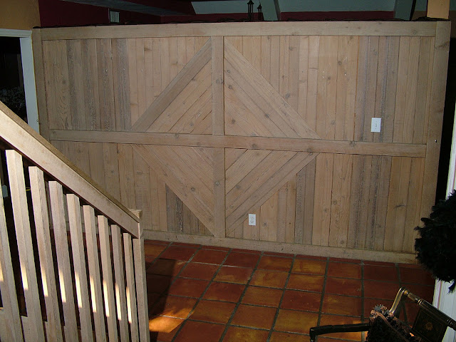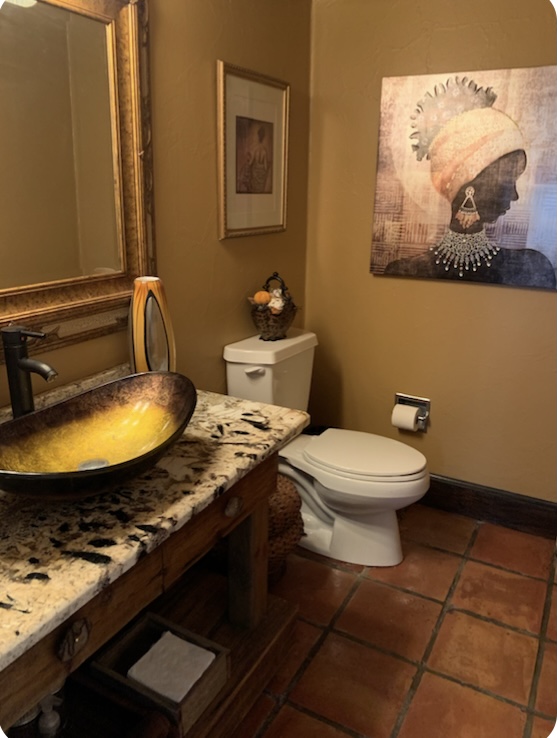 We got creative in the powder room and constructed a custom vanity from a dilapidated privacy fence. We used brown shipping paper on the walls. Then painted the space a golden hue. Shall we talk about the granite and the vessel sink? I love them both. Need I say more?