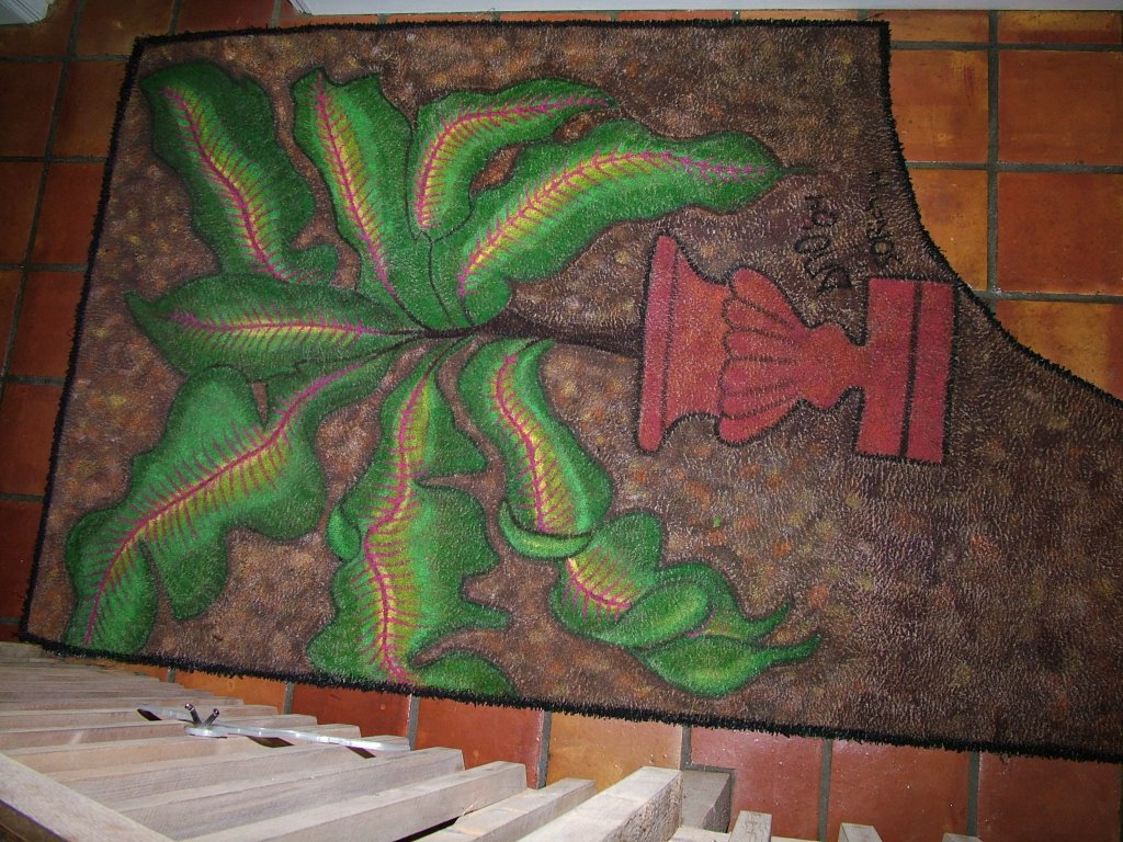 The rug is a piece of carpet remnant leftover from a previous project. I commissioned my daughter to paint the beautiful palm tree in a terracotta pot. She did so during the four hurricanes that ravaged Florida in 2004: Charley, Frances, Ivan, and Jeanne. The rug remained in the foyer until we moved.