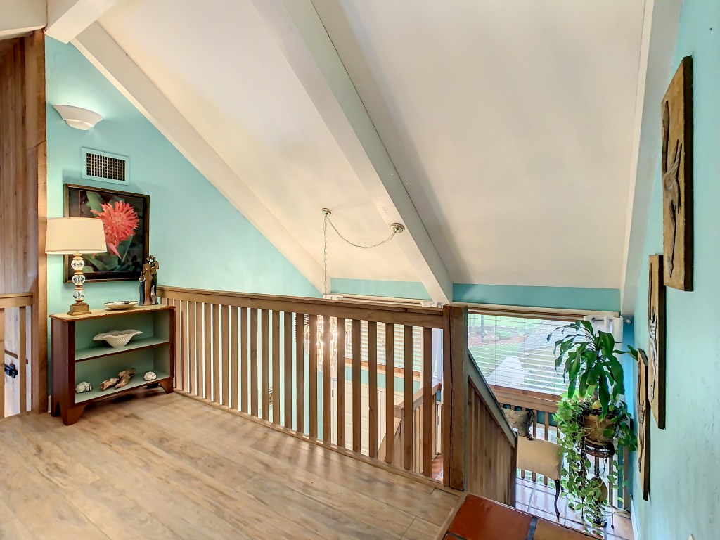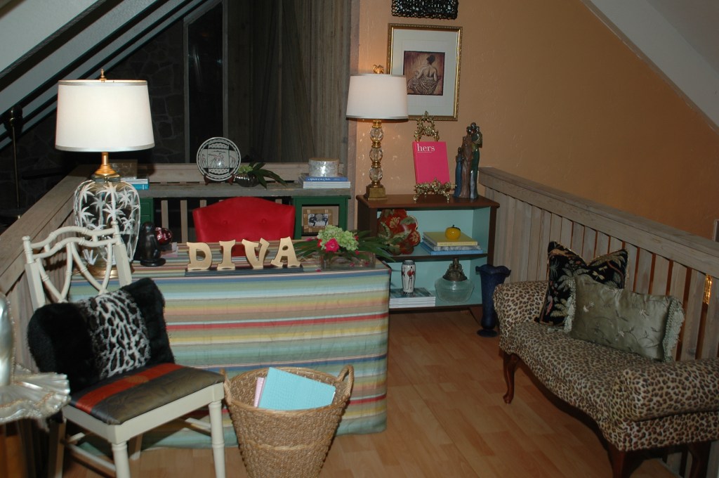 The area at the top of the staircase to the right used to be my office. We staged this space as a sitting/reading area.