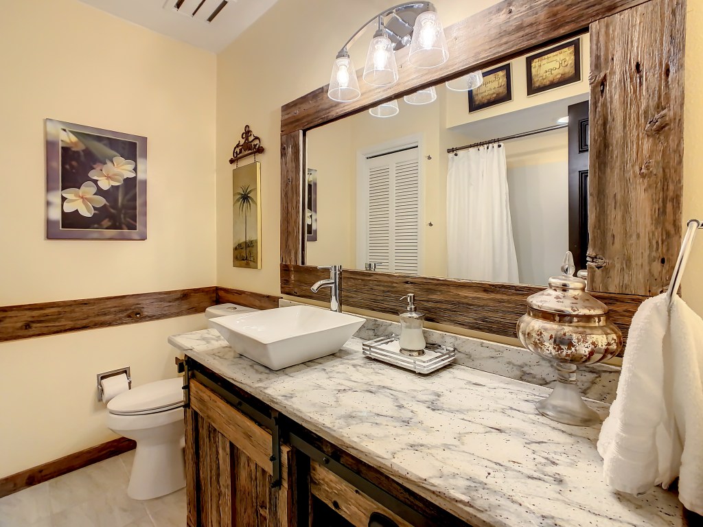 The dilapidated fence came in handy once again. It’s the same wood used for the downstairs powder room. The wood in this space was used for the vanity, baseboards, chair rail, and mirror. You like?
