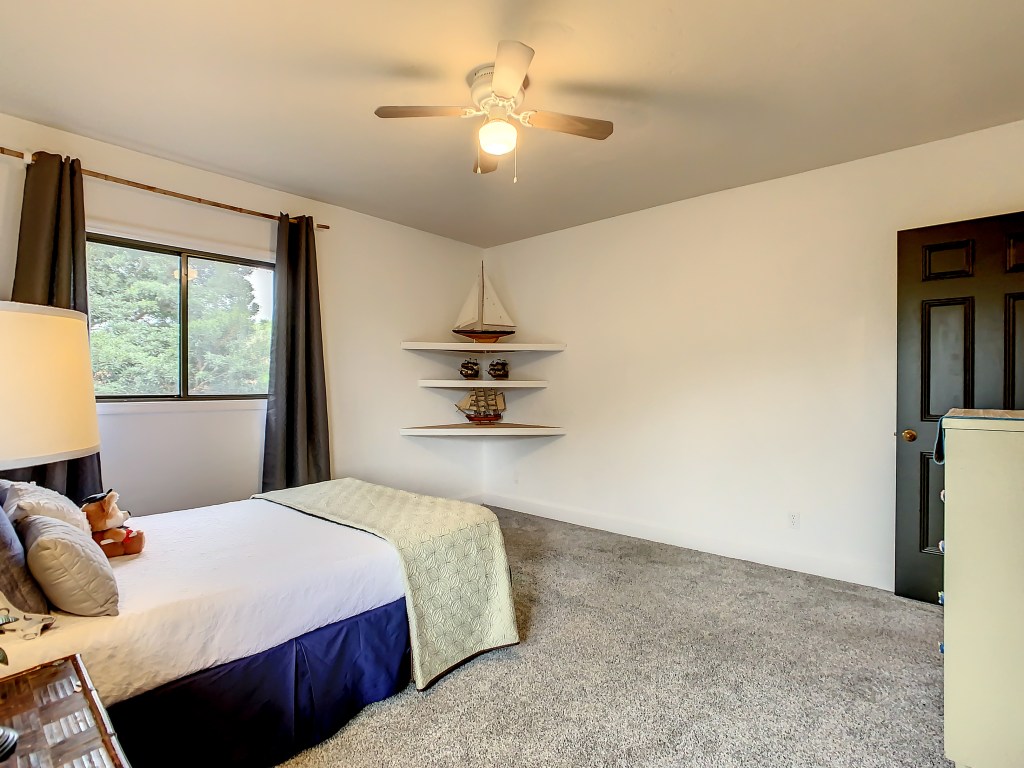When we staged the upstairs, we decided to paint the walls white, and the doors black; using a matte finish. We figured it would update/freshen things up a bit. By the way, the walls are painted Polar Bear. by Behr. It’s one of my favorite whites.