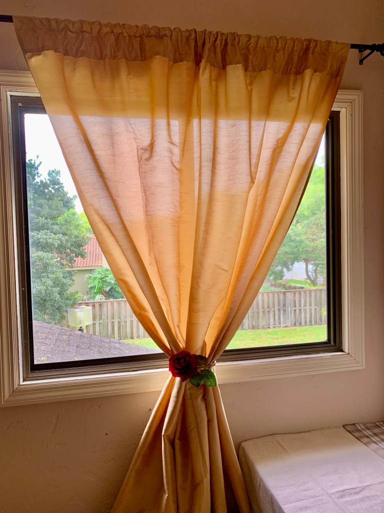 To add pizazz to a plain curtain panel, I gathered the curtain in the center. Then, I used an artificial flower to hold the curtain in place. Like this look? You should try it!