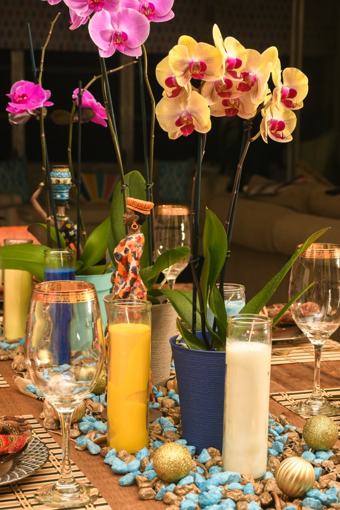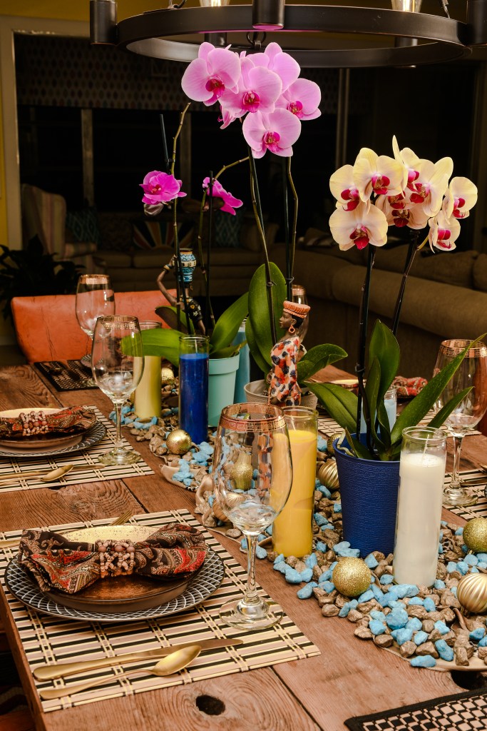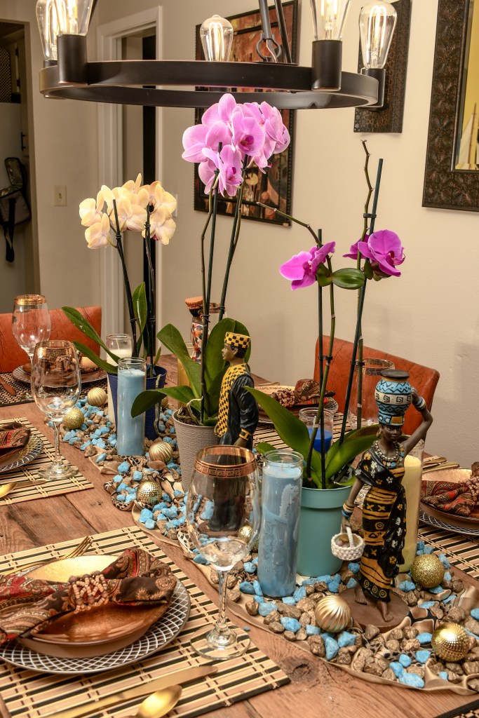 What do Orchids, African figurines, and rocks have to do with Thanksgiving? If you said Absolutely nothing, I beg to differ. I know this isn’t a typical table setting but who cares?