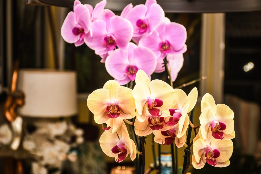 I used the Orchids as a starting point and built from there. Initially, I considered using a tablecloth. However, I decided against it. I wanted to show off most of the table’s imperfections.