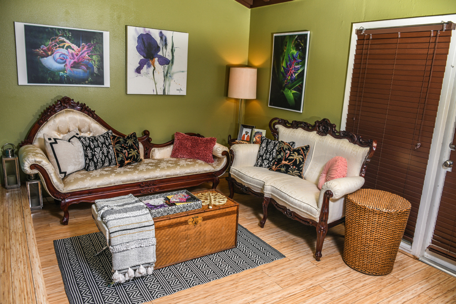 How quaint and cozy is this space? The furniture is not apartment-size but it fits the space nicely. I think the scale of the furniture makes the area appear larger. What about the artwork? I took the seashell picture and the blue tango picture on an outing at Bok Tower Gardens.