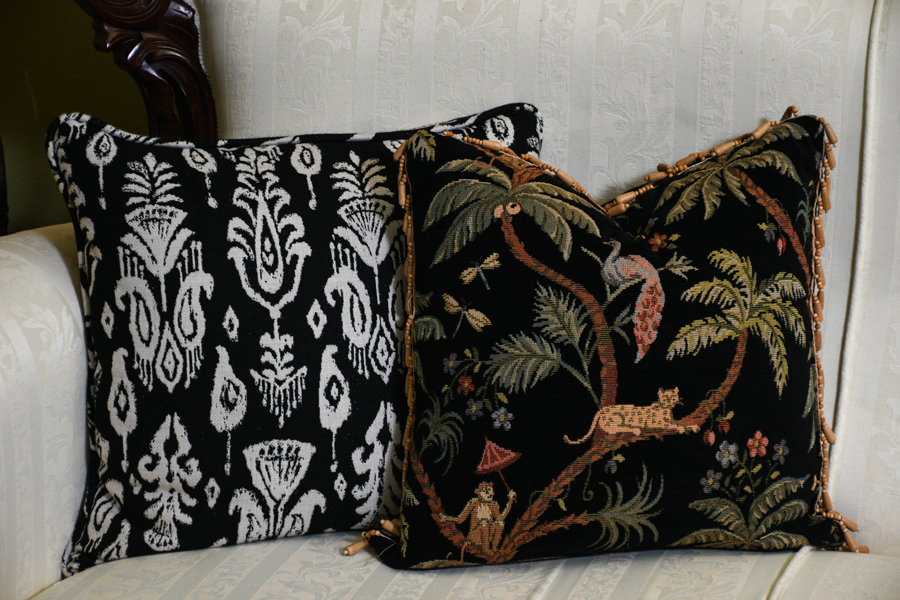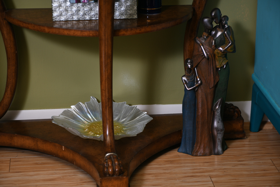 Although the furniture is not my style, I think it makes quite a statement. The addition of exotic pillows makes the sofa look less formal. I intentionally left the side table blank. This allows me to place a book or drink down without having to move anything.